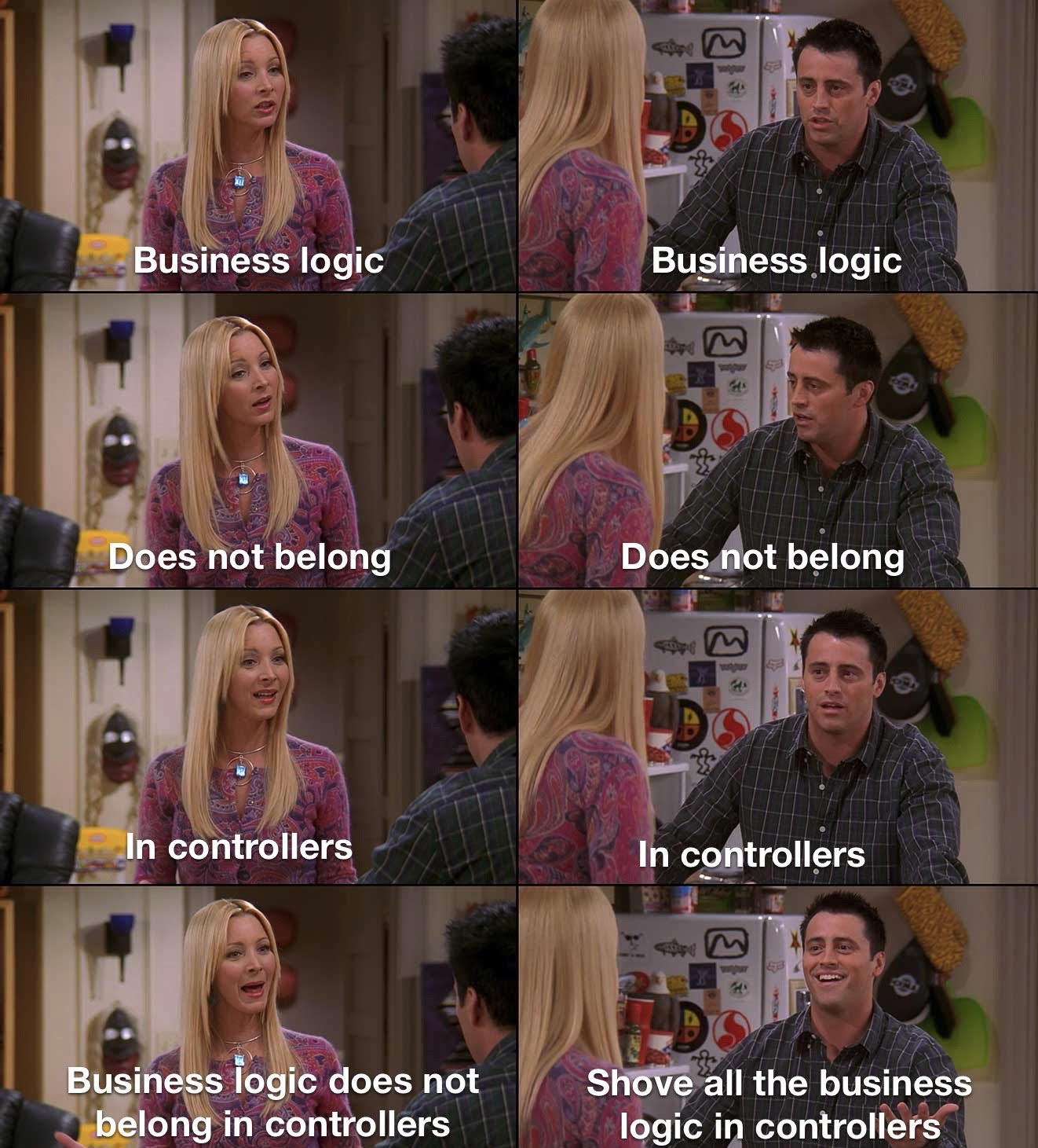 Admittedly, or not, we've all worked on projects during our careers that took the above meme's approach of "just put it in the controller and we'll figure it out later". Unfortunately for some, this is a way of life due to project budget constraints, unrealistic product deadlines, and more senior developers refusing to change their ways because it "works." It's like how the old saying goes, you can't teach an old programmer to decouple independent concerns.